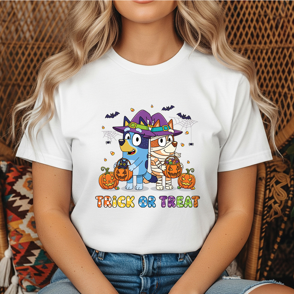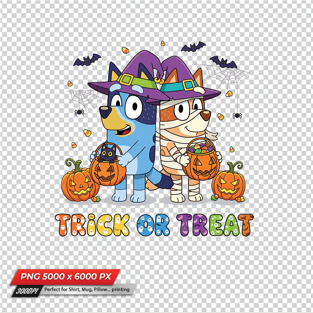 Celebrate Halloween with the beloved characters from the hit animated series Bluey! This Trick or Treat sublimation PNG features two adorable dogs dressed in festive costumes — one in a purple witch hat holding a pumpkin pail with a cute black cat, and the other in a mummy wrap holding a candy-filled pumpkin bucket. Surrounded by carved pumpkins, bats, spiders, and cobwebs, this design captures the playful and heartwarming charm of Bluey. The high-resolution PNG with a transparent background is perfect for personal projects such as t-shirts, mugs, tote bags, posters, and party invitations.