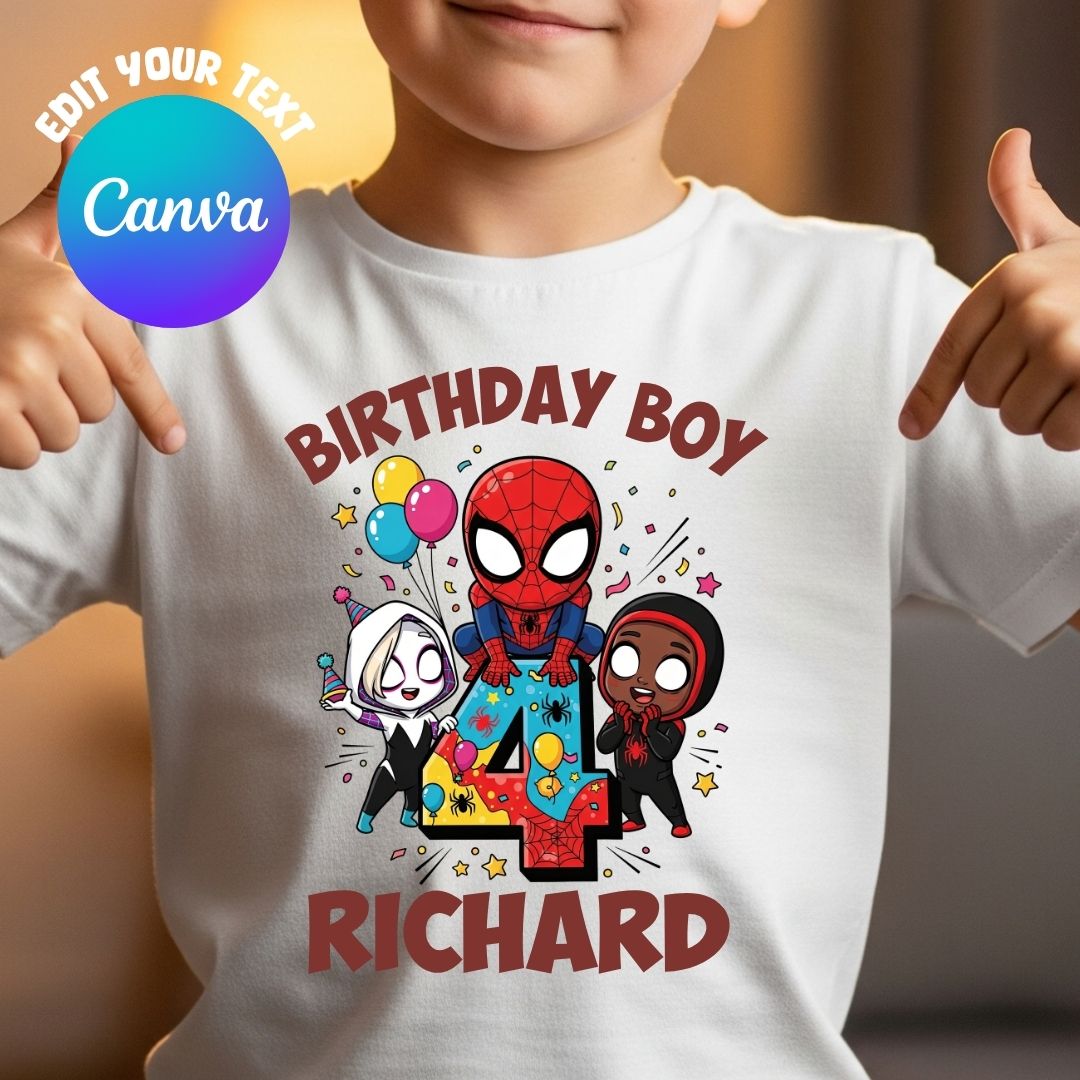 Canva editbale Spidey and his amazing friends For 4th Birthday Shirt Template