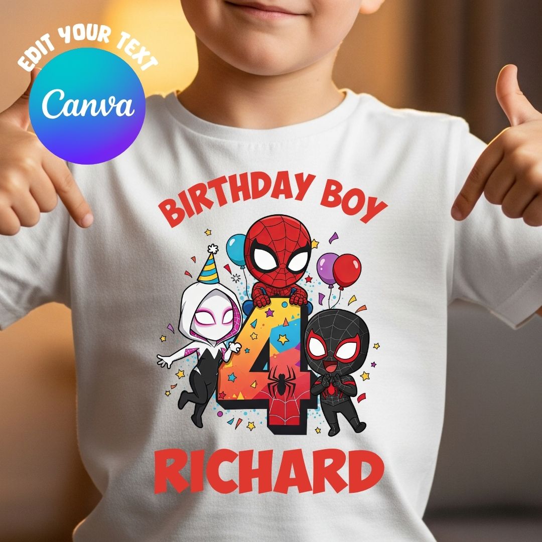 Canva editbale Spidey and his amazing friends For 4th Birthday Shirt Template