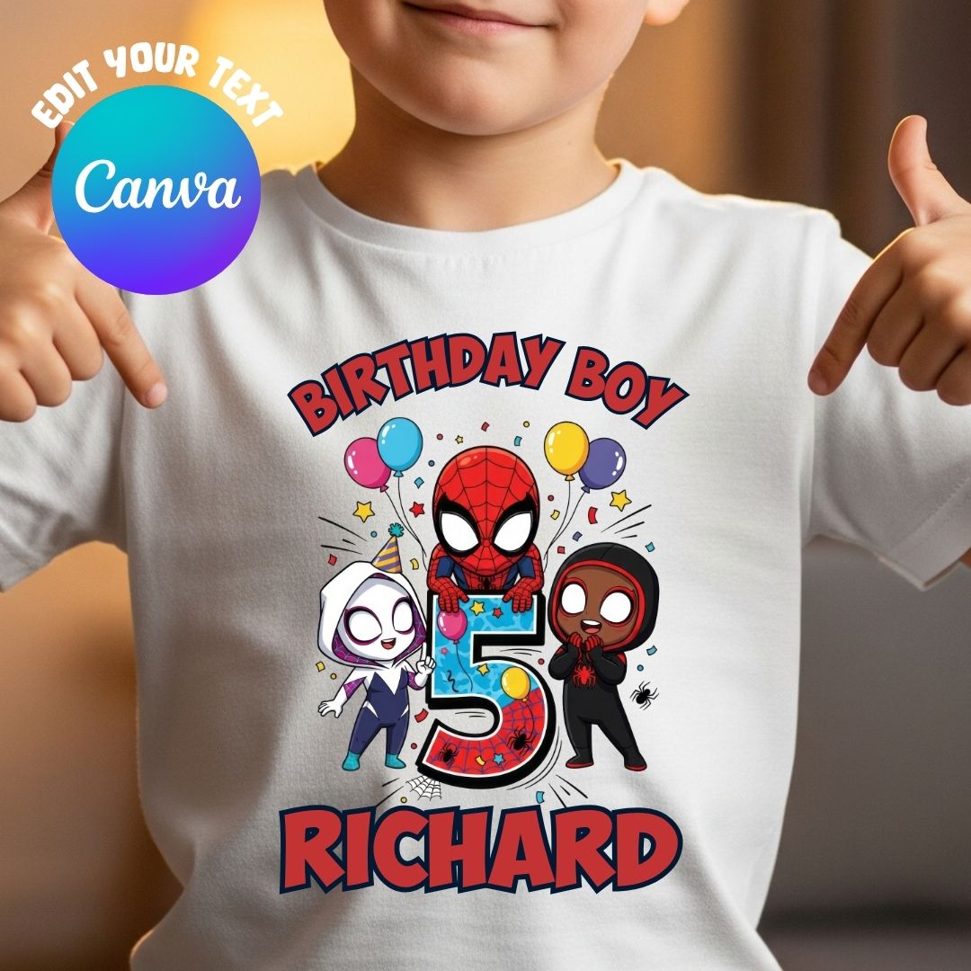 Canva editbale Spidey and his amazing friends For 5th Birthday Shirt Template