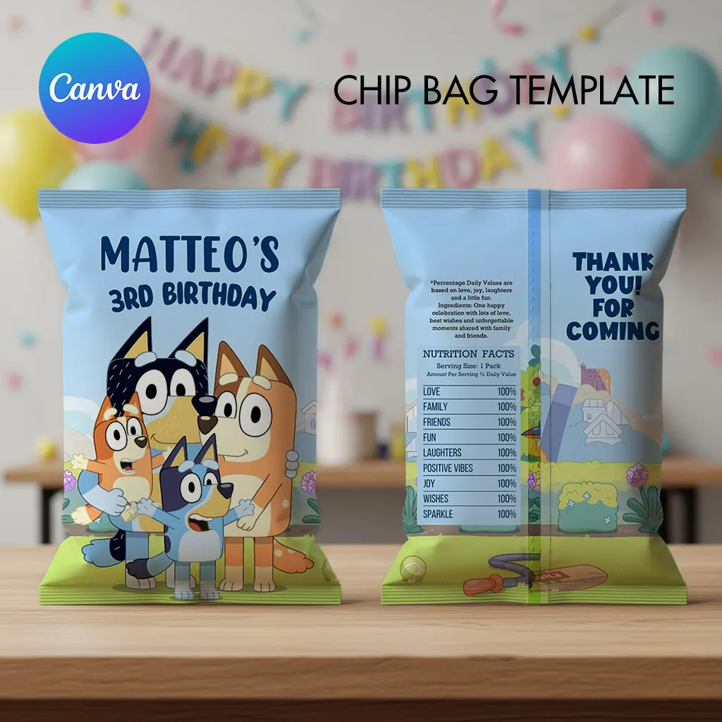 Editable Bluey Chip Bag Template | Birthday Chip Bag Template Printable