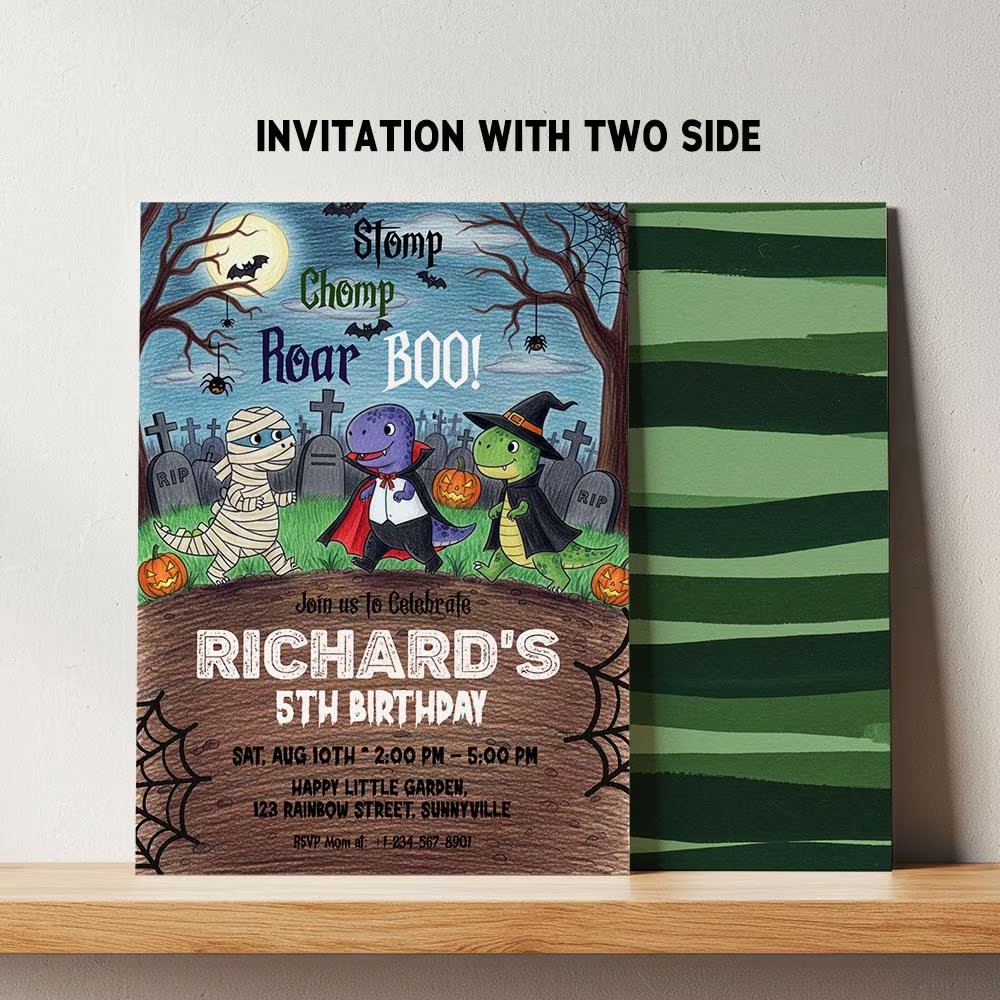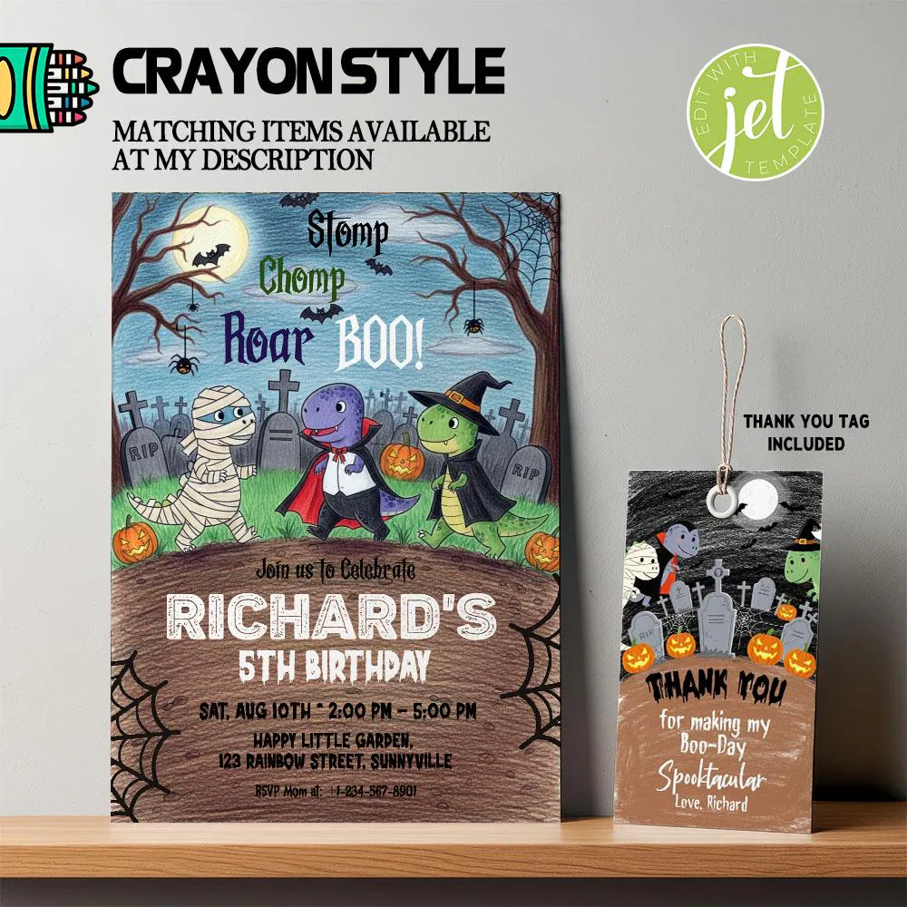 Make your childās party roar with fun using this Editable Dinosaur Halloween Birthday Invitation š¦š. Featuring a playful mix of dinosaurs and spooky Halloween vibes, this template is perfect for kids who love dinos and Halloween fun.