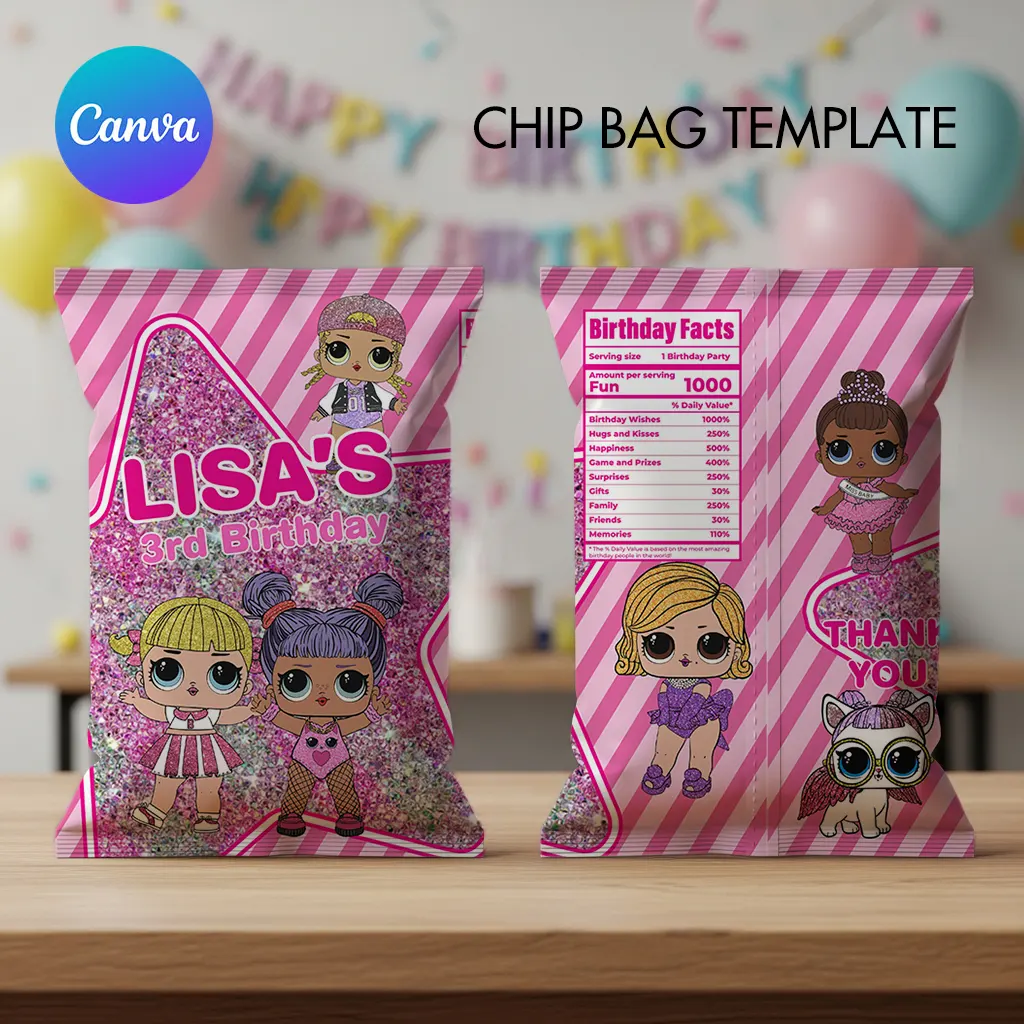 Editable Lol Surprise Dolls Chip Bag template, Birthday Chip Bag template printable