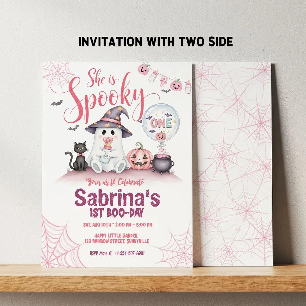 This invitation is ideal for parents looking to host a Halloween birthday party for a baby girl turning one.