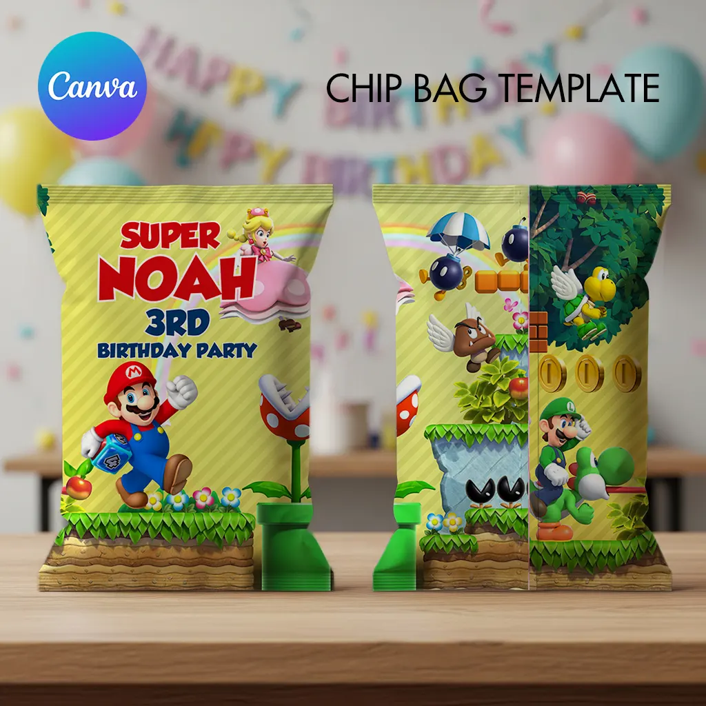 Level up your party with this Editable Super Mario Bros Chip Bag Template šŸŽ®šŸ„! Perfect for a Super Mario themed birthday celebration, this printable chip bag wrapper can be customized with your child’s name, age, and a fun message.