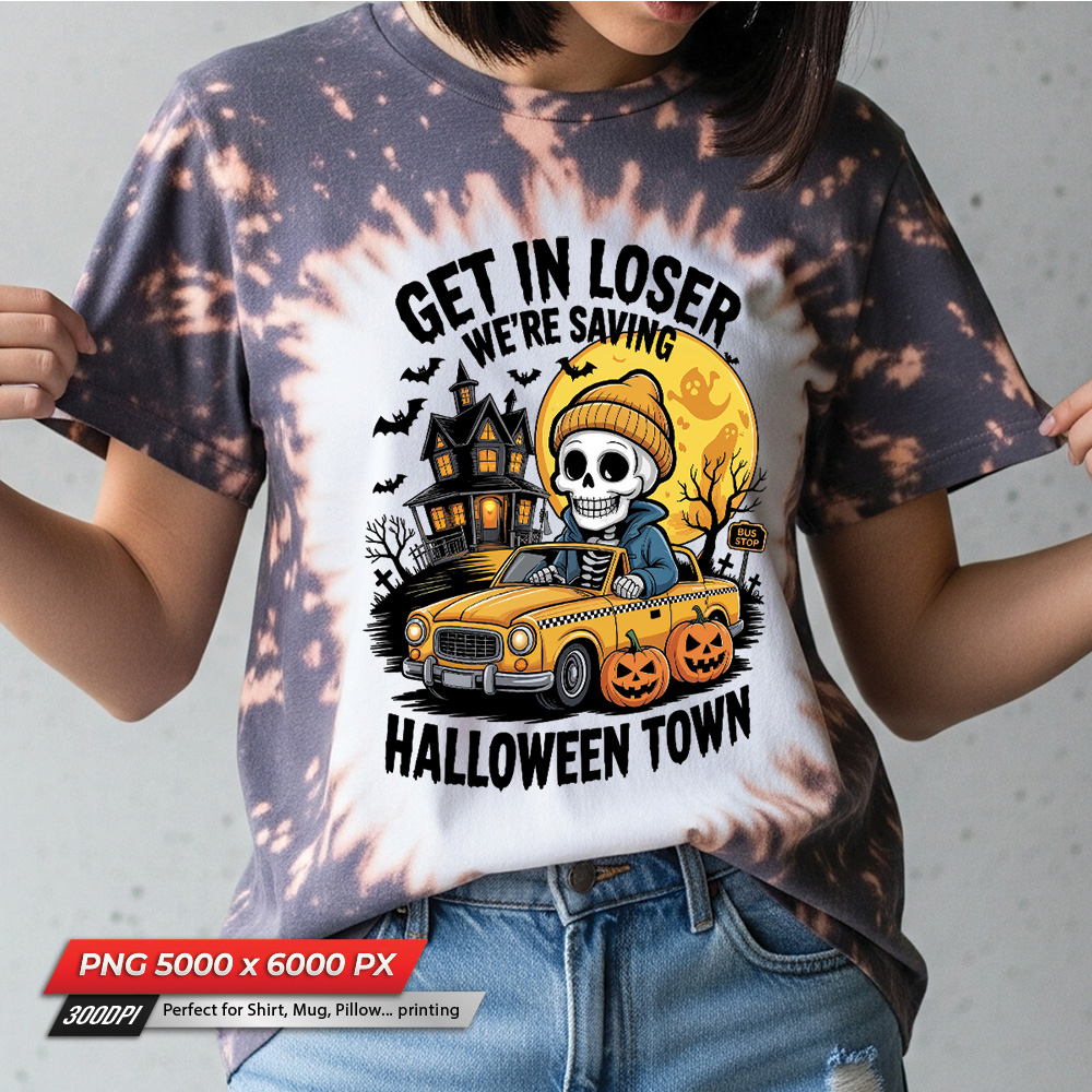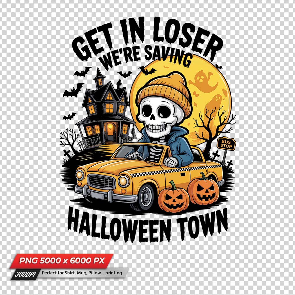Bring some spooky humor to your Halloween creations with this “Get in Loser We’re Saving Halloween Town” sublimation PNG file! Featuring a cheerful skeleton in a yellow taxi surrounded by pumpkins, a haunted house, bats, and a glowing full moon, this design is perfect for Halloween lovers who enjoy a fun twist on the spooky season. Ideal for making T-shirts, hoodies, mugs, tote bags, and seasonal party decorations. The high-resolution PNG with a transparent background ensures easy use for your DIY sublimation or print projects.