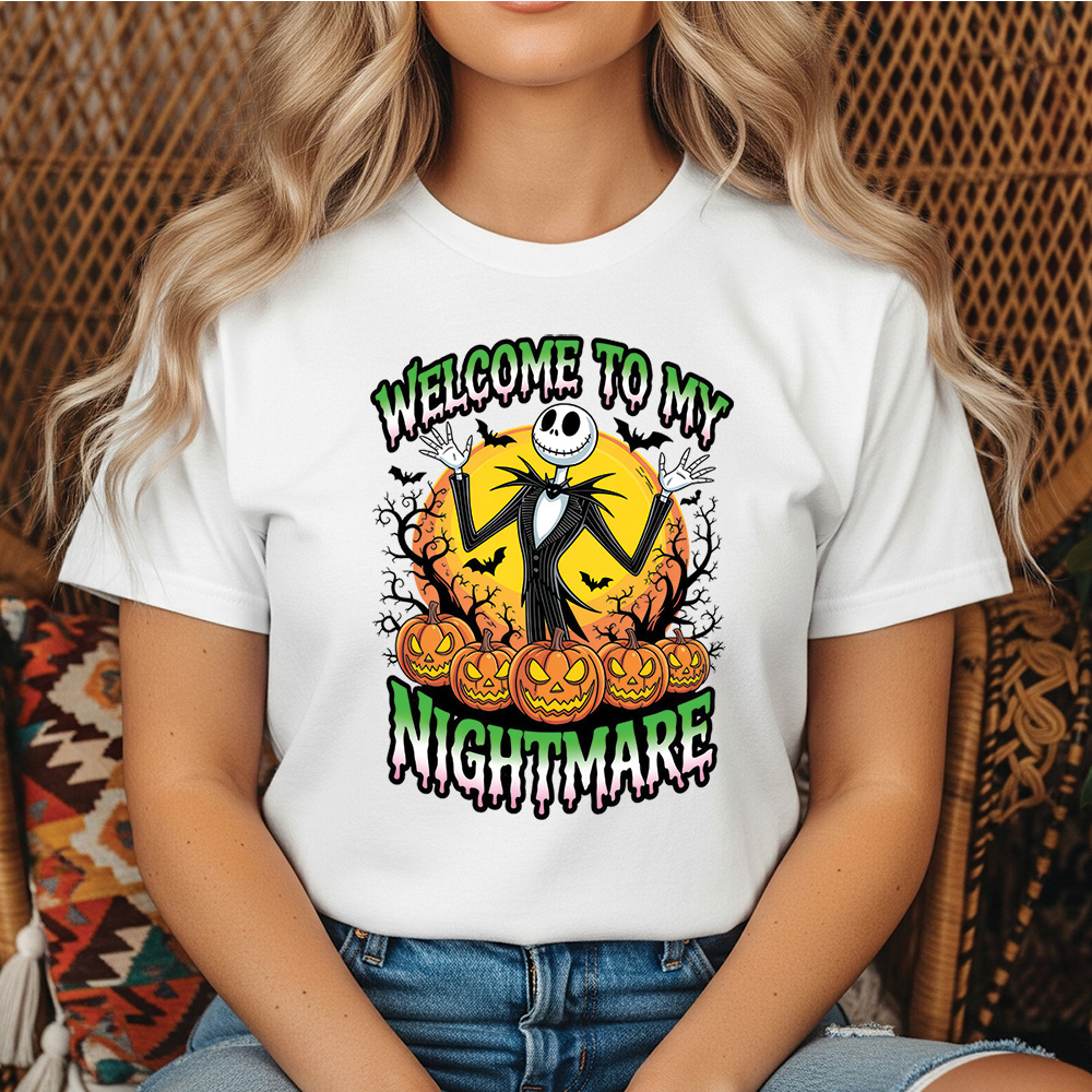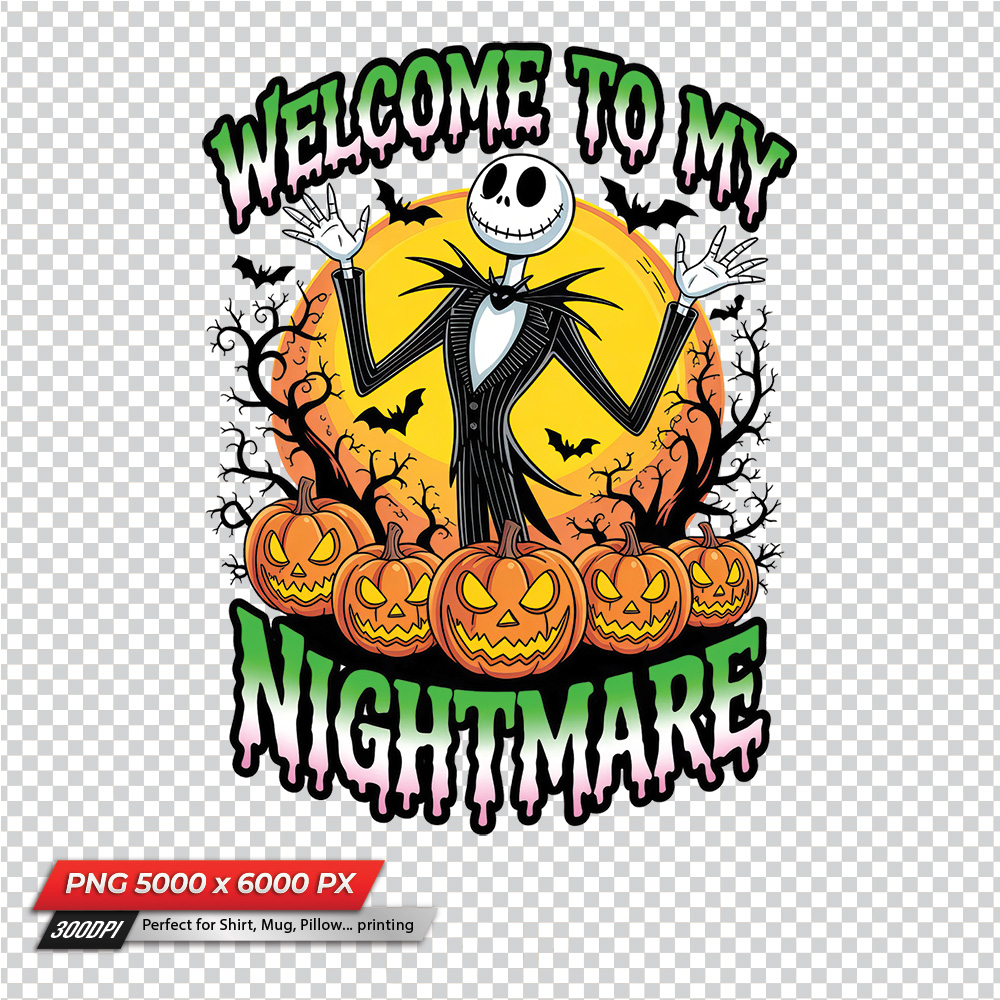 Step into the spooky world of The Nightmare Before Christmas with this Welcome to My Nightmare sublimation PNG! Featuring Jack Skellington standing in front of a glowing full moon, surrounded by twisted tree branches, flying bats, and five menacing jack-o’-lanterns, this design perfectly captures the eerie charm of Tim Burton’s classic film. With its high-resolution PNG format and transparent background, it’s ideal for creating personal Halloween shirts, hoodies, mugs, tote bags, posters, or decorations.