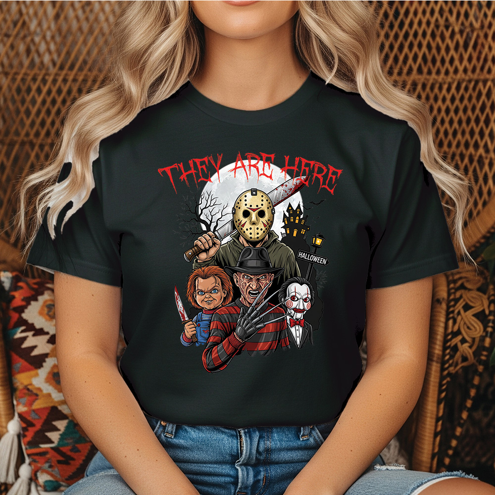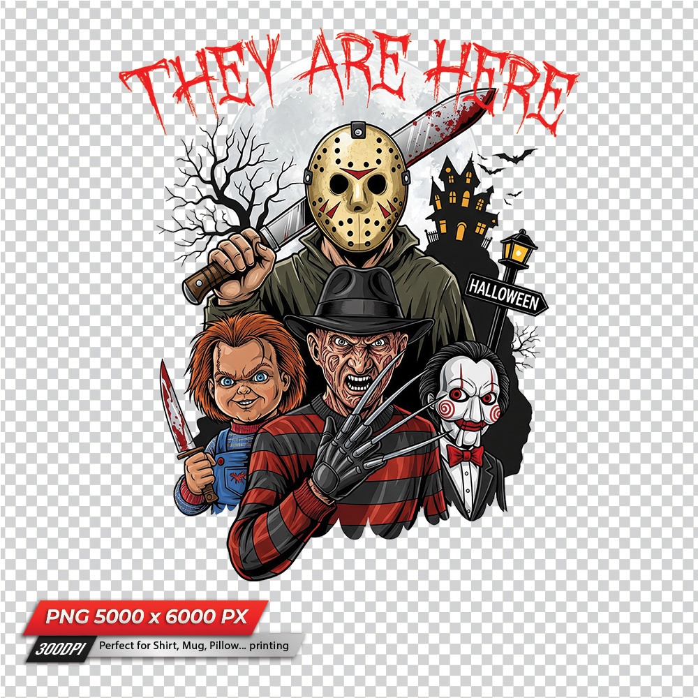Jason, Freddy, Chucky & Billy T-Shirt PNG Design, Bold Colors, Perfect for Halloween & Horror Fans Sublimation PNG file