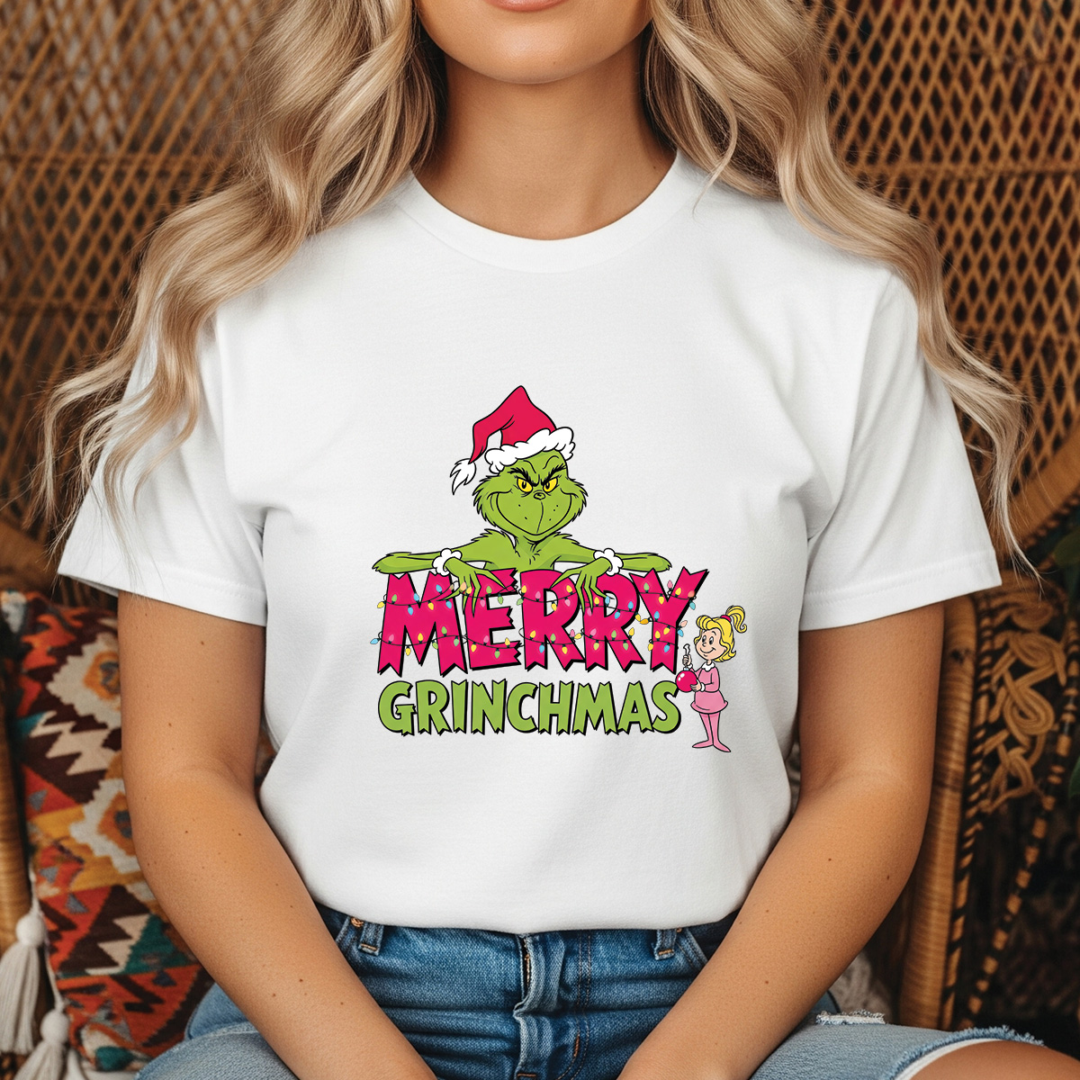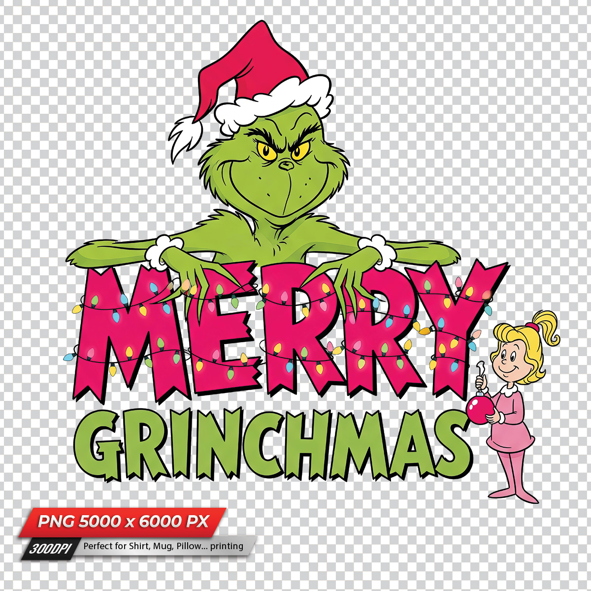 This “Merry Grinchmas” design features the iconic Grinch from Dr. Seuss’s How the Grinch Stole Christmas wearing a red Santa hat and grinning over big pink “MERRY” letters strung with colorful Christmas lights. Below, “GRINCHMAS” is written in bold green letters, and Cindy Lou Who stands on the side holding a bright red Christmas ornament. Perfect for printing on T-shirts, hoodies, mugs, tote bags, posters, and festive décor. Great for holiday parties, Christmas lovers, Grinch fans, and anyone who enjoys a touch of playful mischief in their winter celebrations.