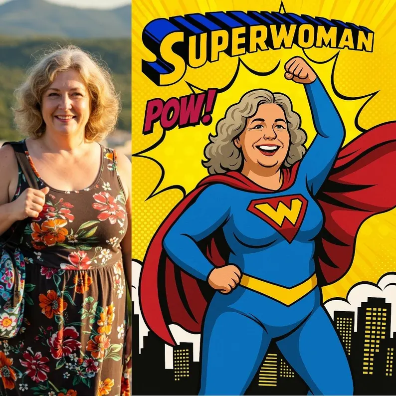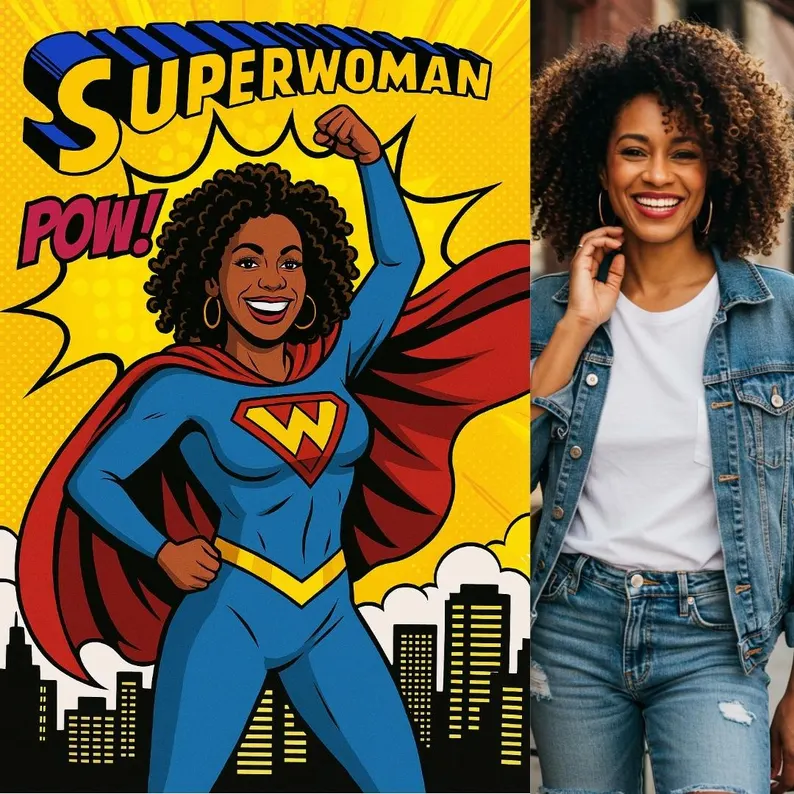 We take your photo and transform it into a bold, retro-inspired Pop Art style, featuring striking comic book colors, halftone textures, and superhero elements that bring the Superwoman persona to life.